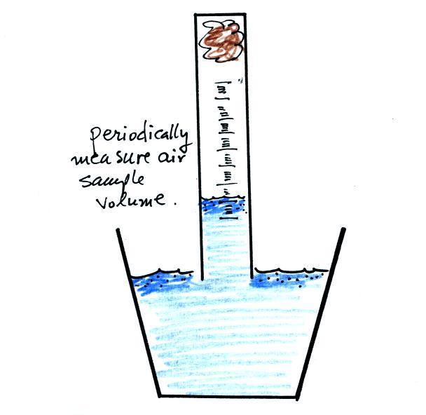 Periodically lift the cylinder just enough to be able to read the water level.  Don't lift the open end of the cylinder out of the water as this would break the seal and you would need to restart the experiment (extra pieces of steel wool will be available in class should this happen).  Also make a note of the time.