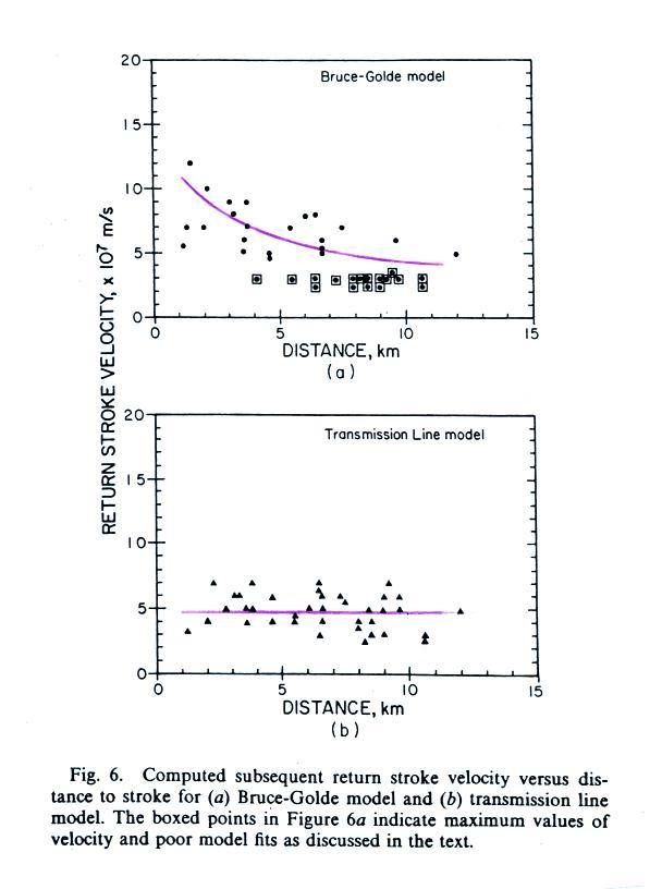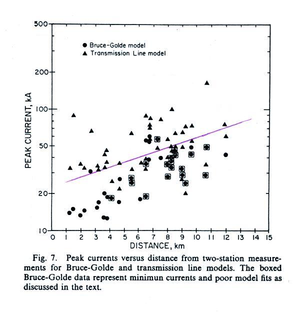 Note both the peak I and peak dI/dt occur when the tip of the upward moving return stroke current waveform is close to the ground. This assumption that the return stroke channel is straight and vertical might not be too bad at this point.
